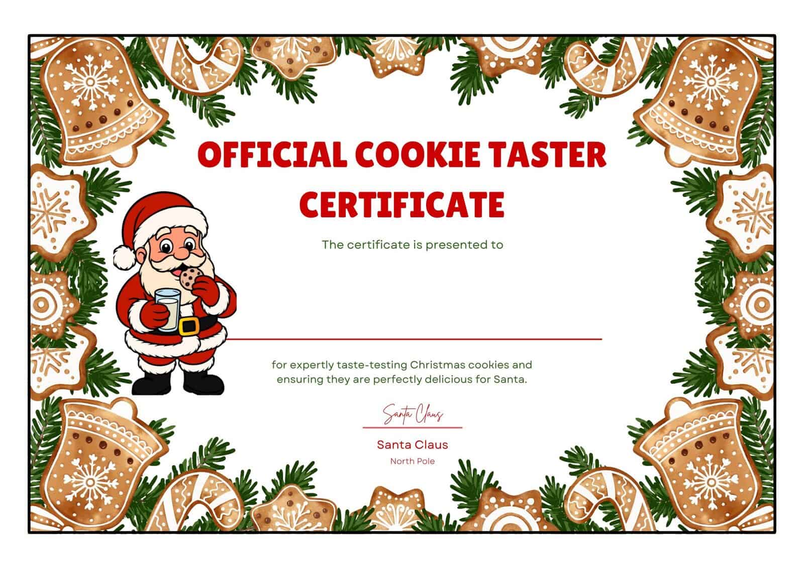 - Official Cookie Taster Certificate for expertly taste-testing Christmas cookies and ensuring they are perfectly delicious for Santa. This printable christmas award certificate makes a truly playful option for kids, parties, baking sessions, or fun holiday traditions.