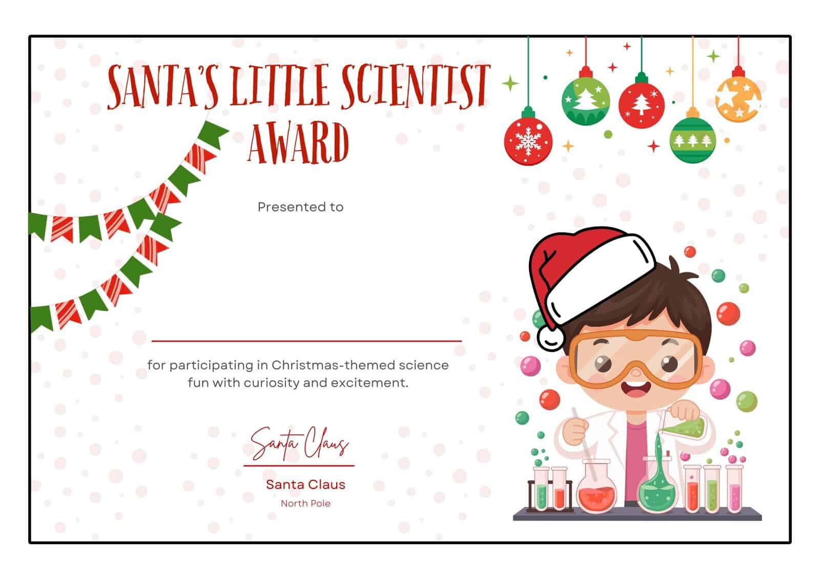 - Santa's Little Scientist Award / Physical Science Christmas Certificate for showing impressive effort, curiosity, and scientific thinking in physical science during the Christmas season. This certificate is great for STEM classes and science labs.
