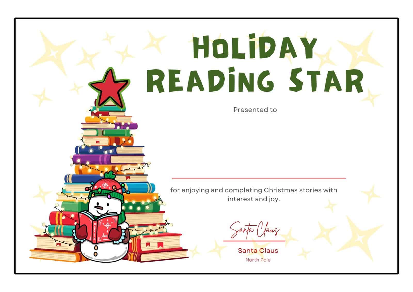 - Holiday Reading Star for completing a Christmas Reading Log with dedication, curiosity, and a love for stories. Parents and teaches can use this before winter break or during holiday reading challenges. This template is great for primary school, middle school, high school, or adult education programs.