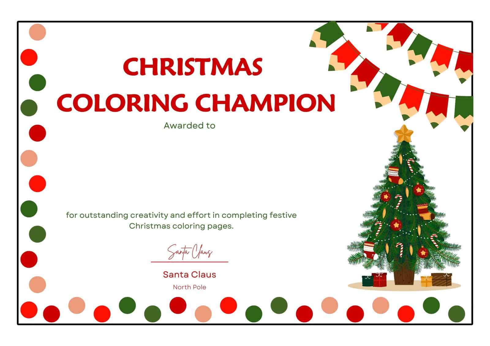 - Christmas Coloring Champion for outstanding creativity and effort in completing festive Christmas coloring pages like these printable Christmas patterns, Christmas unicorn coloring pages and Santa footprint printables. This template makes a great addition when children gather during the festive season or at family gatherings.