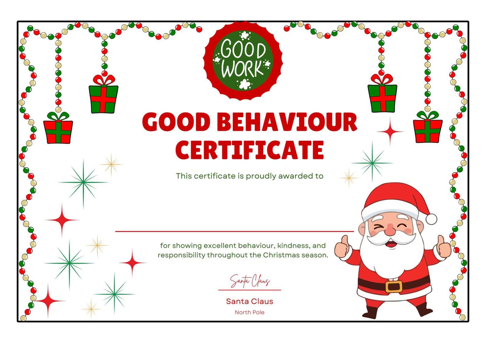 - Good Behavior Certificate for showing excellent behavior, kindness, and responsibility throughout the Christmas season. This certificate is great for reinforcing good behavior in primary school, middle school, high school, and at home. Teachers, parents, and caregivers can use this to highlight positive choices during this time of year.