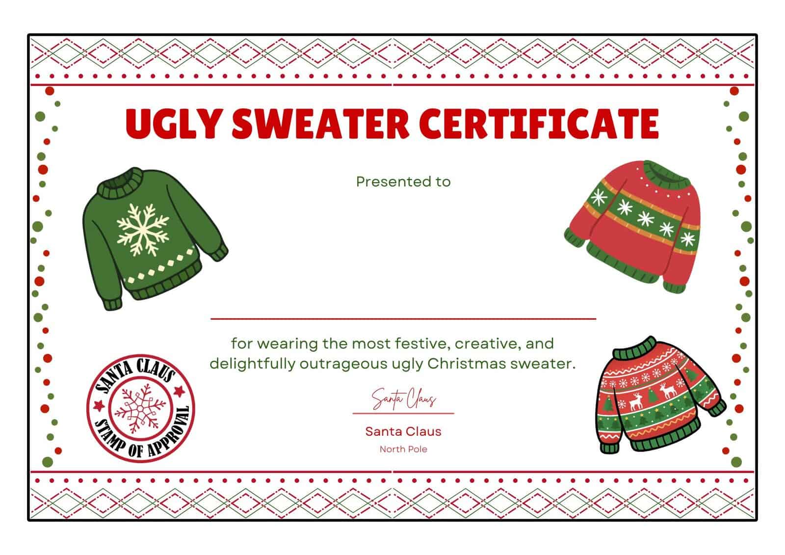 - Ugly Sweater Certificate for wearing the most festive, creative, and delightfully outrageous ugly Christmas sweater. This certificate makes a really fun addition to ugly sweater certificates at office parties, family gatherings, classroom celebrations, or friendly contests shared on social media.