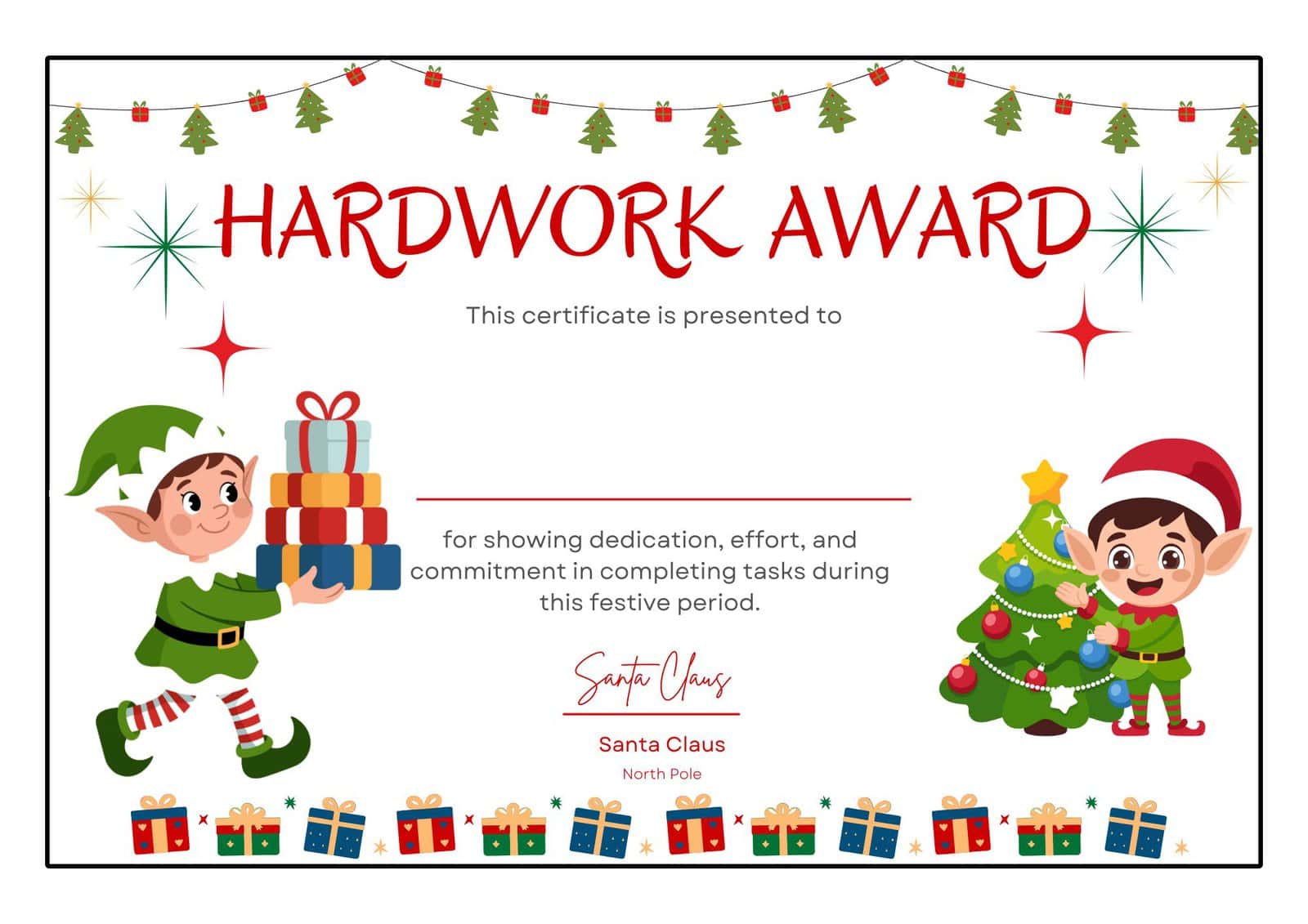 - Hard Work Award for showing dedication, effort, and commitment in completing tasks during this festive period. This is ideal for encouraging students, employees, and anyone demonstrating hard work as the year comes to a close.