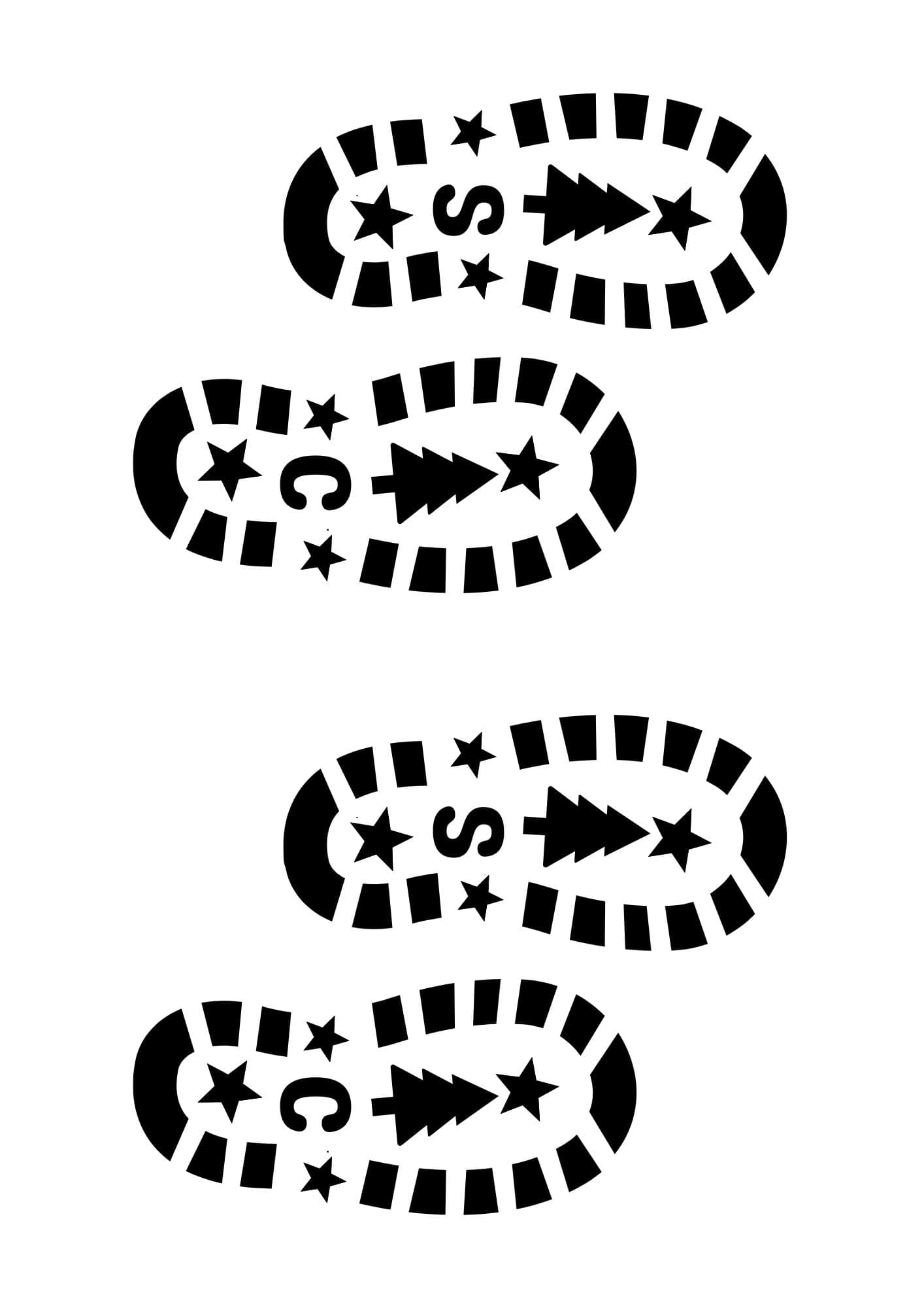Santa footprint printable templates in solid black and outline modes, overlapping on one another.